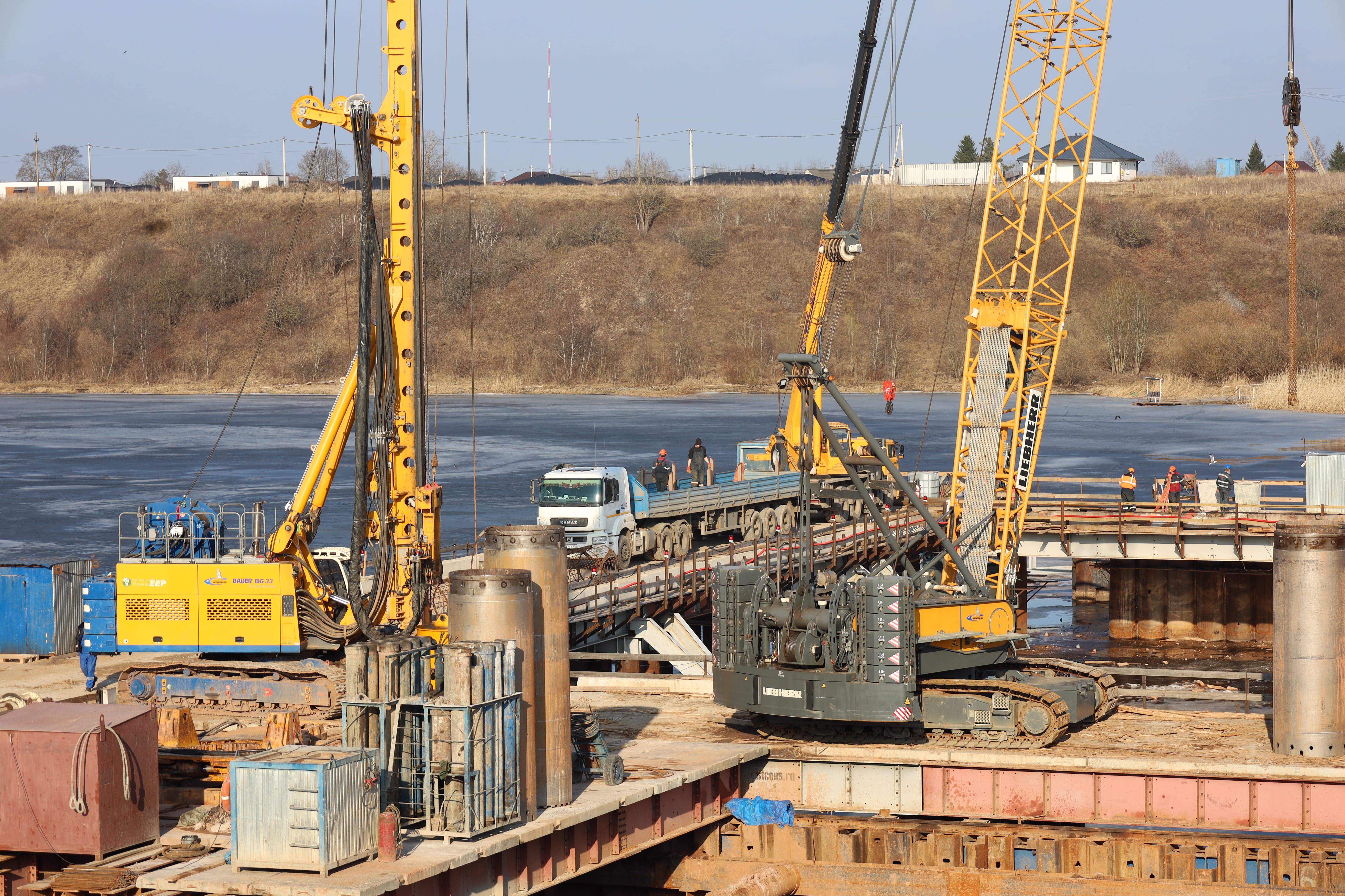 Параллельно на берегу со стороны деревни Хотицы идет сборка металлического пролетного строения, которое надвигается гидравлическими домкратами на опоры в русле реки. Уже готово 150 пог. м пролетного строения. Современная технология надвижки сокращает сроки монтажа примерно на 40 % по сравнению с другими методами и повышает точность установки. Полностью завершить этот этап планируется до конца года.